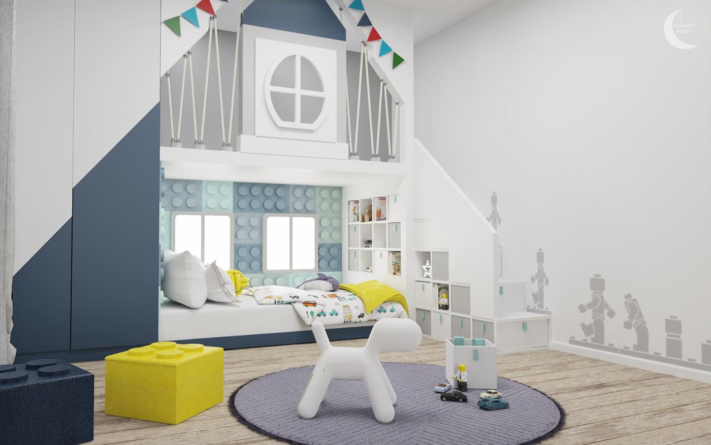 Pokój z motywem LEGO, zamieszkały przez 4 letniego Borysa. Chłopiec uwielbia tworzyć budowle z klocków, stąd pomysł na zaprojektowanie domku bohaterów LEGO.
