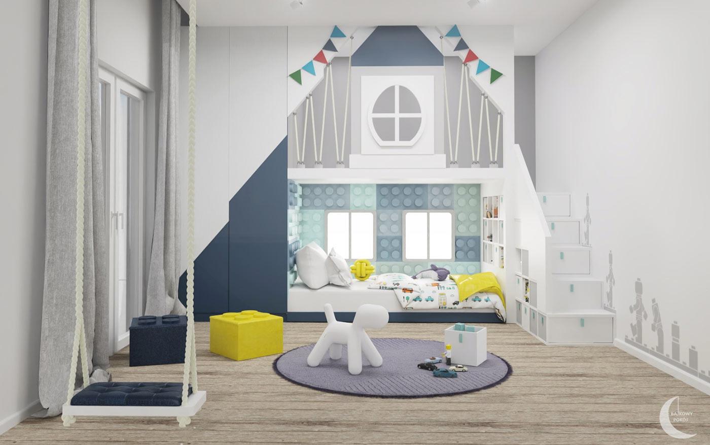 Panele tapicerowane w kształcie klocków zostały zwieńczone podświetlanymi elementami w postaci okien. Schody na antresolę posiadają szuflady , pełniące rolę kolejnego miejsca do przechowywania. Na jednej ze ścian wprowadzono naklejki z motywem dziecięcego pokoju. W królestwie Borysa nie mogło zabraknąć huśtawki oraz puf w kształcie klocków.