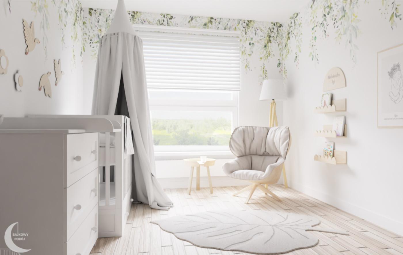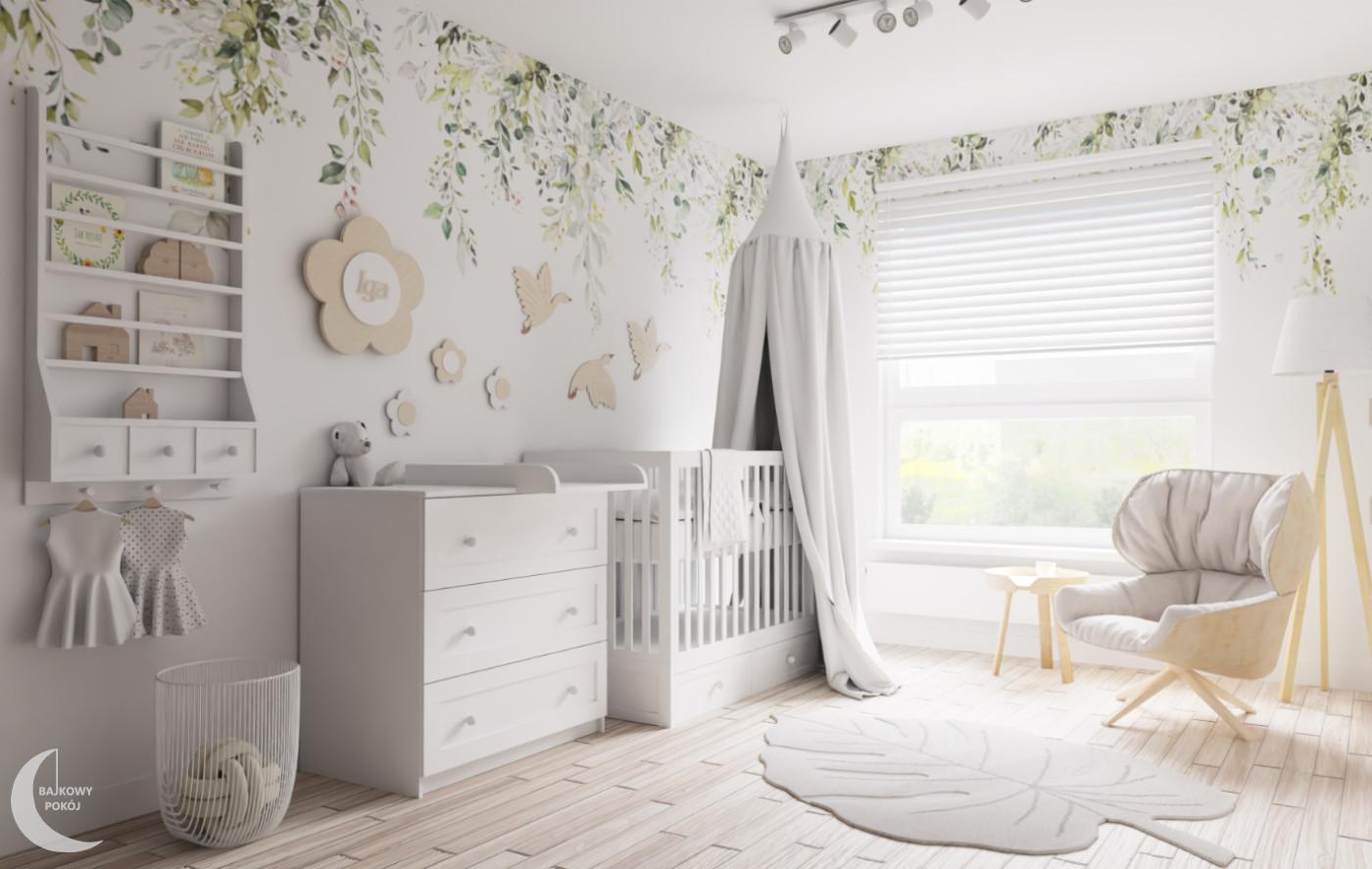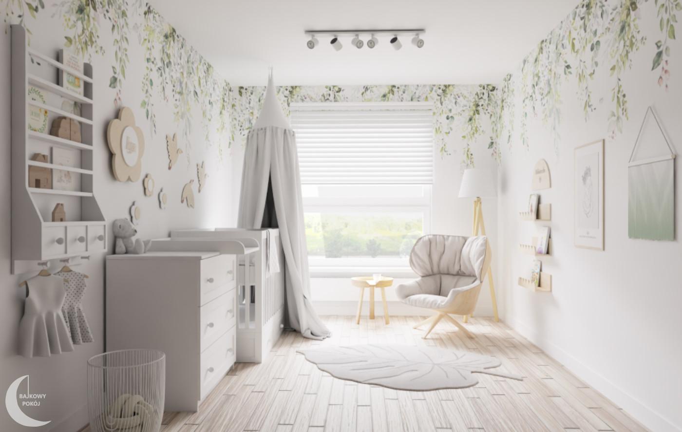 W pokoju Igi królują naturalne materiały oraz jasne, stonowane kolory. Mimo małej przestrzeni udało się wprowadzić wszystkie niezbędne strefy w pokoju dziewczynki. Kluczową rolę odgrywa kwiecista ,delikatna tapeta,podkreślona drewnianymi dekoracjami. Łóżeczko z baldachimem zlokalizowane zostało w okolicach okna, tuż obok stanął wygodny fotel do karmienia, na którym rodzice będą mogli również czytać książeczki Idze, sięgając po nie z spersonalizowanej biblioteczki. Przewijak wraz z miejscem na odwieszanie ubranek znajduje się obok łóżeczka Igi. Miejsce na przechowywanie zaplanowane zostało na ścianie obok drzwi.