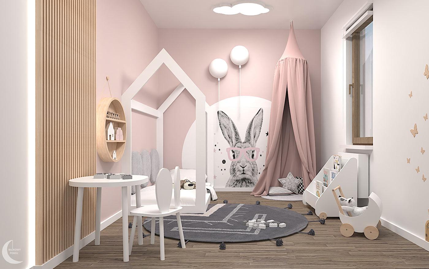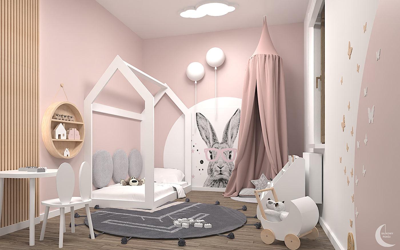 Przytulny pokoik 2 letniej Amelki. Wnętrze zostało zaprojektowane z gotowych produktów, rodzicom dziewczynki zależało na szybkim i łatwym remoncie, aby jak najszybciej stworzyć przyjazną przestrzeń dla ich córeczki. Pokój z motywem królika oraz pudrowego różu. Łóżko domek uwzględnia okrągłe panele tapicerowane , korespondujące z kilkoma innymi okręgami we wnętrzu.