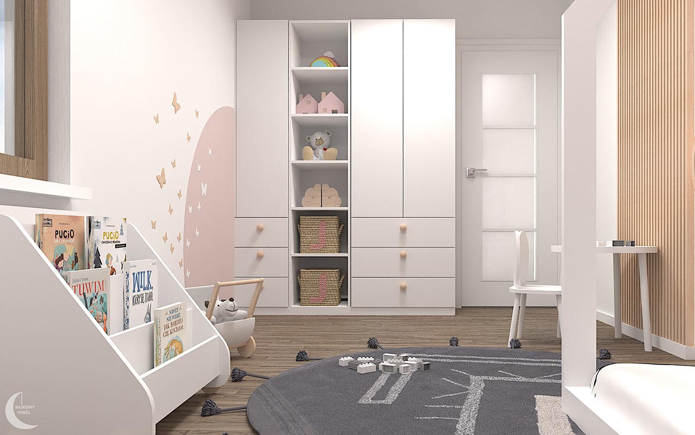Obok miejsca odpoczynku zawisła drewniana półka na ekspozycję zabawek, natomiast w jej sąsiedztwie znalazły miejsce pionowe, drewniane lamele, wydzielające przestrzeń dla stolika i krzesełka z motywem królika. Na przeciwległej ścianie znajdują się drzwi wróżki , w otoczeniu białych i drewnianych motylków. Strefa wyciszenia to baldachim , tuż obok umiejscowiona została mobilna półka na ulubione książeczki Amelki.